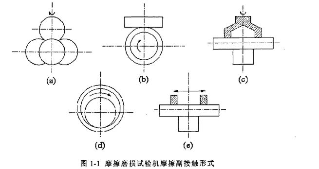 常见的摩擦磨损试验机摩擦副接触运动方式在下图中列出,其中a.图所示的是四球摩擦磨损试验机的摩擦副接触方式。上球卡在一个专用弹性夹头内,下面三个球固定并加以载荷,此种方式下设备试样接触形式是典型的点接触,可以通过测量摩擦力和接触磨斑直径的变化来评定润滑剂的承载能力。b.图所示的是环块试验机摩擦副接触方式,此种方式下接触形式为线接触,通过测量上试样摩擦力大小和磨痕的宽度来评定上试样摩擦磨损性能。c.图所示为端面摩擦磨损试验机的摩擦副接触方式。主要采用面接触形式,上试样加工呈环形端面,下试样为待测样品。特别适合于在油润滑和干摩擦条件下,对式样的摩擦磨损性能进行试验检测。d.图所示为PV摩擦磨损试验机的摩擦副接触方式,主要用来测定轴承合理的配合间隙和PV值。e.图所示为往复摩擦磨损试验机摩擦副接触方式,上试样下试样均加工成块状,上试样以一定额率在下试样表面做往复运动,以此来评定下试样的摩擦磨损性能。目前,已有许多新型的多功能摩擦磨损试验机,他们具有多种试件接触和运动形式,只要更换试件加剧模块,就可以完成多种不同类型的实验和组合实验。